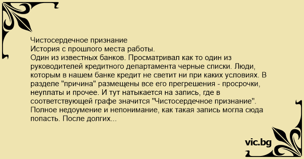 Один из известных банков. Просматривал как то один из руководителей кредитного департамента черные списки. Люди, которым в нашем банке кредит не светит ни при каких условиях. В разделе "причина" размещены все его прегрешения - просрочки, неуплаты и прочее. И тут натыкается на запись, где в соответствующей графе значится "Чистосердечное признание". Полное недоумение и непонимание, как такая запись могла сюда попасть. После долгих разбирательств вышли на операционистку, которая данную запись ввела.