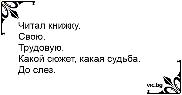 Читал книжку. <br />Свою. <br />Трудовую. <br />Какой сюжет, какая судьба. <br />До слез.