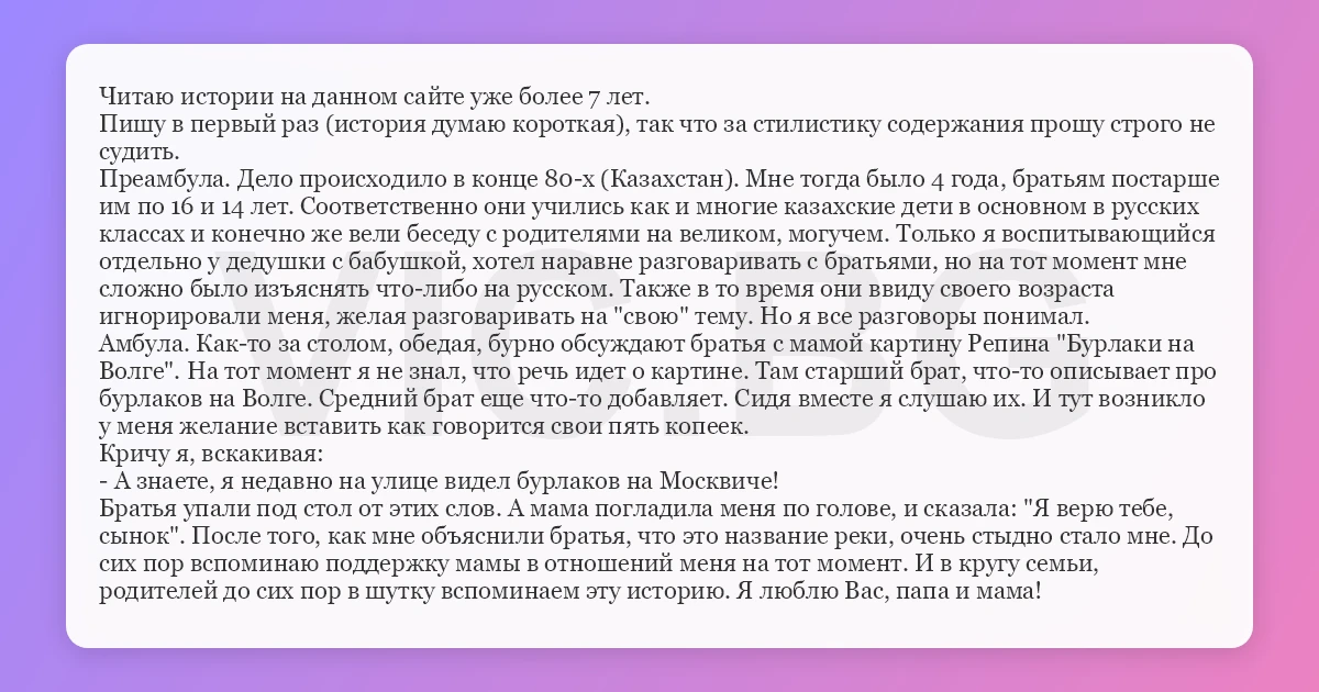 Читаю истории на данном сайте уже более 7 лет. Пишу в первый раз (история думаю короткая), так что за стилистику содержания прошу строго не судить. Преамбула. Дело происходило в конце 80-х (Казахстан). Мне тогда было 4 года, братьям постарше им по 16 и 14 лет. Соответственно они учились как и многие казахские дети в основном в русских классах и конечно же вели беседу с родителями на великом, могучем. Только я воспитывающийся отдельно у дедушки с бабушкой, хотел наравне разговаривать с братьями, но на тот момент мне сложно было изъяснять что-либо на русском. Также в то время они ввиду своего возраста игнорировали меня, желая разговаривать на "свою" тему. Но я все разговоры понимал. Амбула. Как-то за столом, обедая, бурно обсуждают братья с мамой картину Репина "Бурлаки на Волге". На тот момент я не знал, что речь идет о картине. Там старший брат, что-то описывает про бурлаков на Волге. Средний брат еще что-то добавляет. Сидя вместе я слушаю их. И тут возникло у меня желание вставить как говорится свои пять копеек. Кричу я, вскакивая: - А знаете, я недавно на улице видел бурлаков на Москвиче! Братья упали под стол от этих слов. А мама погладила меня по голове, и сказала: "Я верю тебе, сынок". После того, как мне объяснили братья, что это название реки, очень стыдно стало мне. До сих пор вспоминаю поддержку мамы в отношений меня на тот момент. И в кругу семьи, родителей до сих пор в шутку вспоминаем эту историю. Я люблю Вас, папа и мама!
