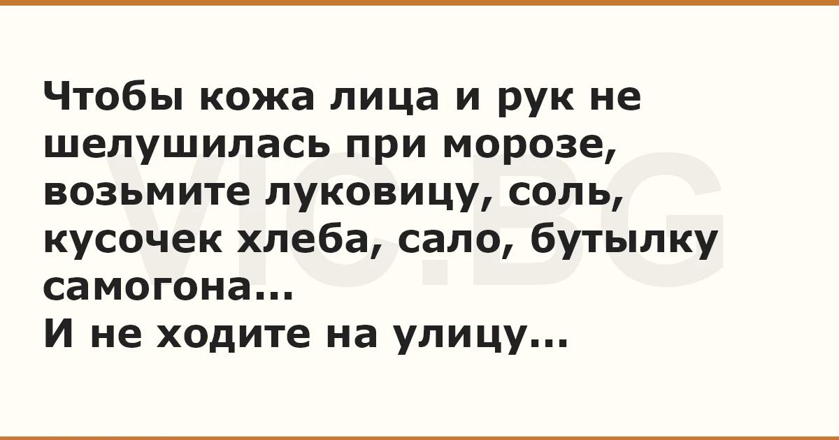 Чтобы кожа лица и рук не шелушилась при морозе, возьмите луковицу, соль, кусочек хлеба, сало, бутылку самогона... И не ходите на улицу...