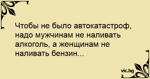 Чтобы не было автокатастроф, надо мужчинам не наливать алкоголь, а женщинам не наливать бензин...