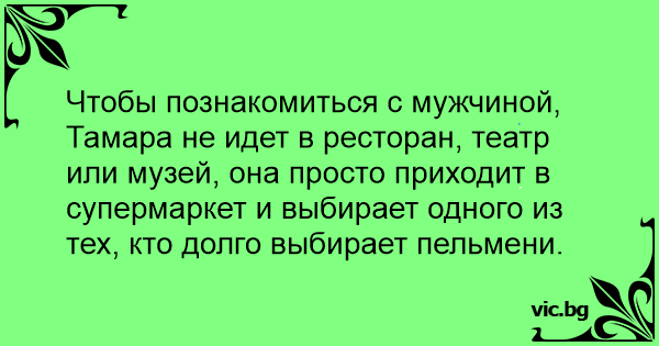 Чтобы познакомиться с мужчиной, Тамара не идет в ресторан, театр или музей, она просто приходит в супермаркет и выбирает одного из тех, кто долго выбирает пельмени.