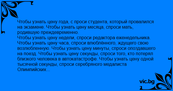Чтобы узнать цену недели, спроси редактора еженедельника. Чтобы узнать цену часа, спроси влюблённого, ждущего свою возлюбленную. Чтобы узнать цену минуты, спроси опоздавшего на поезд. Чтобы узнать цену секунды, спроси того, кто потерял близкого человека в автокатастрофе. Чтобы узнать цену одной тысячной секунды, спроси серебряного медалиста Олимпийских игр. Стрелки часов не остановят свой бег. Поэтому дорожите каждым моментом вашей жизни. И цените сегодняшний день, как величайший дар, который вам дан.