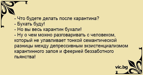 - Ну о чем можно разговаривать с человеком, который не улавливает тонкой семантической разницы между депрессивным экзистенциализмом карантинного запоя и феерией беззаботного пьянства!
