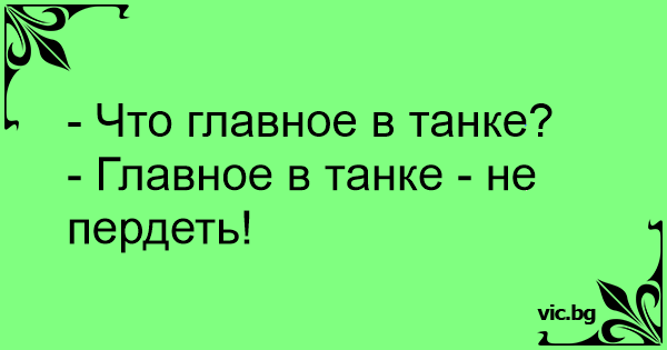 - Редник, какво е важно в един танк? Първи закон на танкиста: - Не пърди в танка!.. Jednostka wojsk pancernych. Młodzi żołnierze stoją przy czołgu. Podchodzi do nich dowódca. - Nazywam się kapitan Dyszel. Od dzisiaj jestem waszym dowódcą. - Tak jest, panie kapitanie. - Żeby nie...