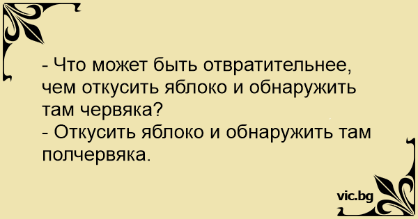 Τι είναι πιο σιχαμερό από το να δαγκώσεις ένα μήλο και να δεις ένα σκουλίκι μέσα Много е гадно да намериш червей в ябълката, Единственото по-лошо от това да видиш червей в ябълката, която ядеш, е да видиш половин червей What's worse than seeing a worm in your apple? - Какво може да е по-гадно от това да отхапеш от ябълката и да видиш червей? ¿Qué es lo peor que te puedes encontrar en una manzana cuando la estas comiendo? Was ist schlimmer als ein Wurm in einem angebissenen Apfel? ¿Qué es peor que encontrar un gusano tras morder una manzana? Encontrar solo medio gusano. Qu'est ce qui est plus dégueulasse qu'un vers dans une pomme ? La moitié d'un vers dans une pomme... Vet du hva som er verre enn å finne en mark i et eple du akkurat har tatt en bit av? Å finne en halv mark. - Finns det något värre än att hitta en mask i ett äpple som man precis har tagit en tugga av? - Ja, att hitta en halv mask... — Чи може бути щось гірше, ніж знайти в яблуці черв'яка? — Так, знайти там половину черв'яка. - Co jest gorsze od znalezienia robaka w właśnie ugryzionym jabłku? - Znalezienie połowy robaka... - Што е полошо од тоа да најдеш црв во јаболко? - Да најдеш пола црв во јаболко!