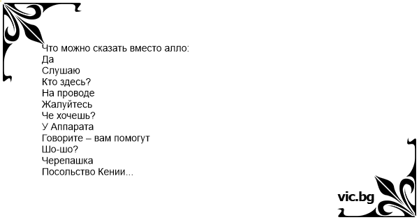 Что можно сказать вместо алло: Да Слушаю Кто здесь? На проводе Жалуйтесь Че хочешь? У Аппарата Говорите – вам помогут Шо-шо? Черепашка Посольство Кении База торпедных катеров на проводе Психушка вас слушает Алоха Говори по существу! Президент на проводе У трубы Чебуречная Дом нервотиков, мы вас слушаем! Психдиспансер, вас слушает крокодил Гена Бог на связи)) Кто ты, чудовище? Жалуйтесь! Пентагон на связи Поросячьи бега, на кого будете ставить? Пронто Первый-первый я второй, как слышите, прием?! Говорите адрес, мы уже выезжаем ФСБ, я вас слушаю Центральный московский крематорий Псих больница № 5 А вы любите макароны? Здравствуйте, автоответчик в отпуске, с вами говорит пылесос! Я вас да-да! Что нужно смертный?