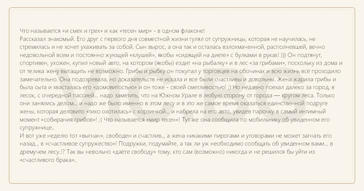 Рассказал знакомый. Его друг с первого дня совместной жизни гулял от супружницы, которая не научилась, не стремилась и не хочет ухаживать за собой. Сын вырос, а она так и осталась взлохмаченной, располневшей, вечно недовольной всем и постоянно жующей «клушей», якобы «сидящей на диете» с булками в руках! ))) Он подтянут, спортивен, ухожен, купил новый авто, на котором (якобы) ездит «на рыбалку» и в лес «за грибами», поскольку из дома и от телика жену вытащить не возможно. Грибы и рыбку он покупал у торговцев на обочинах и всю жизнь всё проходило замечательно. Она подозревала, но доказательств не искала и все были счастливы и довольны. Жена жарила грибы и была сыта и хвасталась его «домовитостью» и он тоже - своей сметливостью! ;) Но недавно поехал далеко за город, в лесок, с очередной пассией... надо заметить, что на Южном Урале в любую сторону от города — кругом леса. Только они занялись делом... и надо же было именно в этом лесу и в это же самое время оказаться единственной подруге жены, которая деловито «тихо охотилась» с корзинкой... и набрела на его авто, увидев парочку в самый интимный момент «собирания грибов»! ;( Что называется «мир тесен»! Тут же она сообщила по мобильнику об увиденном его супружнице..