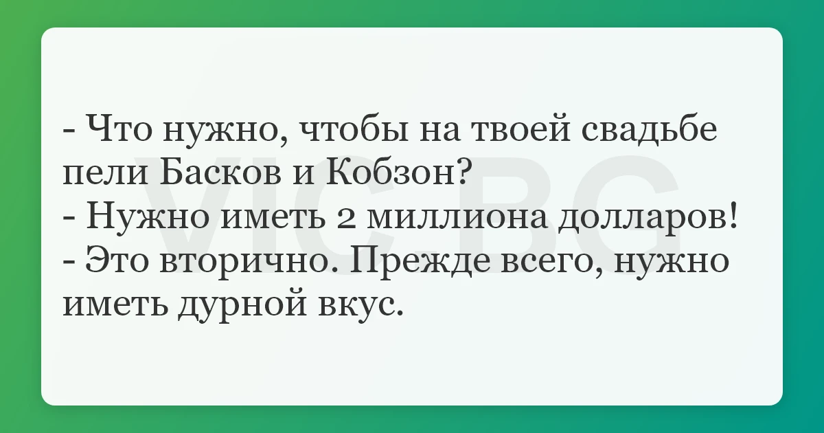 - Что нужно, чтобы на твоей свадьбе пели Басков и Кобзон? - Нужно иметь 2 миллиона долларов! - Это вторично. Прежде всего, нужно иметь дурной вкус.