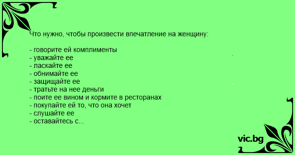 - говорите ей комплименты - уважайте ее - ласкайте ее - обнимайте ее - защищайте ее - тратьте на нее деньги - поите ее вином и кормите в ресторанах - покупайте ей то, что она хочет - слушайте ее - оставайтесь с ней - поддерживайте ее - идите ради нее на край света Как произвести впечатление на мужчину: - разденьтесь и приготовьте пожрать.