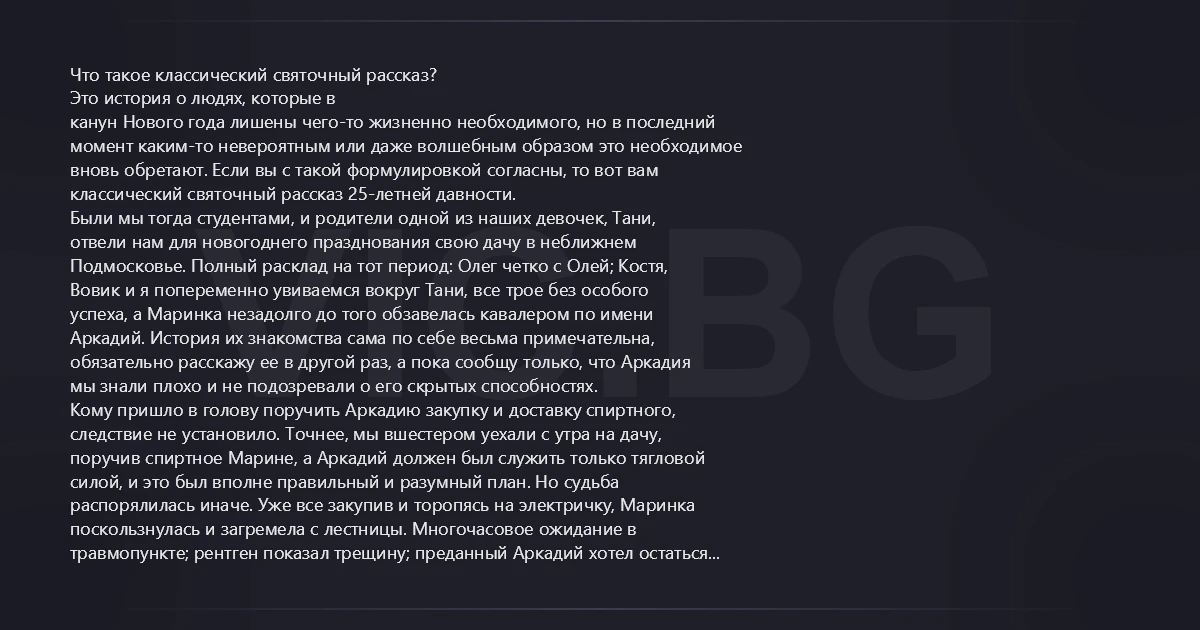 Что такое классический святочный рассказ? Это история о людях, которые в канун Нового года лишены чего-то жизненно необходимого, но в последний момент каким-то невероятным или даже волшебным образом это необходимое вновь обретают. Если вы с такой формулировкой согласны, то вот вам классический святочный рассказ 25-летней давности. Были мы тогда студентами, и родители одной из наших девочек, Тани, отвели нам для новогоднего празднования свою дачу в неближнем Подмосковье. Полный расклад на тот период: Олег четко с Олей; Костя, Вовик и я попеременно увиваемся вокруг Тани, все трое без особого успеха, а Маринка незадолго до того обзавелась кавалером по имени Аркадий. История их знакомства сама по себе весьма примечательна, обязательно расскажу ее в другой раз, а пока сообщу только, что Аркадия мы знали плохо и не подозревали о его скрытых способностях. Кому пришло в голову поручить Аркадию закупку и доставку спиртного, следствие не установило. Точнее, мы вшестером уехали с утра на дачу, поручив спиртное Марине, а Аркадий должен был служить только тягловой силой, и это был вполне правильный и разумный план. Но судьба распорялилась иначе. Уже все закупив и торопясь на электричку, Маринка поскользнулась и загремела с лестницы. Многочасовое ожидание в травмопункте; рентген показал трещину; преданный Аркадий хотел остаться с ней, но Маринка, хорошо представляя, как мы будем страдать без спиртного, погнала его на дачу. Вот тут выдающиеся способности Аркадия себя и проявили. Несмотря на подробнейшую инструкцию, он не то вместо 21-го автобуса сел в 31-й, не то вместо 3-ей остановки сошел на 13-й и оказался совсем в другом дачном поселке, в котором на тот поздний уже час не было ни души. Чтобы потом не отвлекаться, сразу расскажу о его дальнейшей судьбе. К нашему большому нашему сожалению, Аркадий не околел и не был съеден волками, а, многократно провалившись в сугробы и охрипнув от крика, был обнаружен дачным сторожем. Сторож завел его в избушку и напоил водкой из его же собственной сумки. После чего Аркадий полностью выпал из хода событий до середины следующего дня, когда, проснувшись в сторожке и обнаружив, что сторож с друзьями исключительно хорошо встретили Новый год нашей водкой, отбыл с пустой сумкой в Москву. А мы тем временем накололи дров и затопили печь, украсили елку, сварили картошку, нарезали колбасы и сыра, красиво разложили салаты и сели ждать. Все было готово к празднику, но праздник не начинался. Читая сейчас воспоминания других людей, я прихожу к выводу, что моя собственная юность прошла крайне скромно и неинтересно. Никто из нашей компании не уходил в многодневные запои, не был исключен за пьянку из института и даже не попадал в вытрезвитель. Но трезвенниками мы решительно не были, и безалкогольная новодняя ночь совершенно не входила в наши планы. Мы оглядывали стол и смотрели в окно; неохотно брали по бутерброду и смотрели в окно; неуклюже шутили и снова смотрели в окно; не выдержав, выбегали на тропинку, но тропинка была пуста. Время неумолимо приближалось к полуночи, и наконец стало окончательно ясно, что последний автобус со станции прошел, последний автобус на станцию ушел тоже и кина, в смысле вина, до утра не будет. Олежка, вздохнув, налил в бокал лимонада и начал говорить тост. Но все его обычное остроумие куда-то делось, тост не по