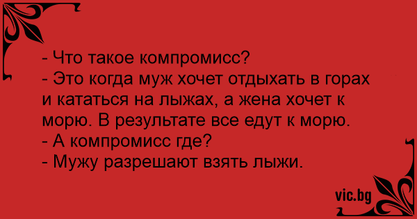 - Это когда муж хочет отдыхать в горах и кататься на лыжах, а жена хочет к морю. В результате все едут к морю.