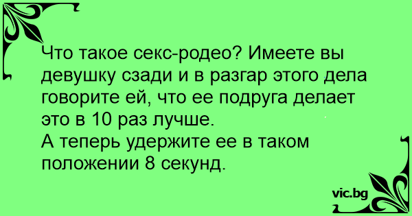 Що таке секс-родео? Трахаєте ви дівчину ззаду і в розпал цієї справи кажете їй, що її подруга робить це у 10 разів краще. А тепер утримаєте її в такому положенні 8 секунд.