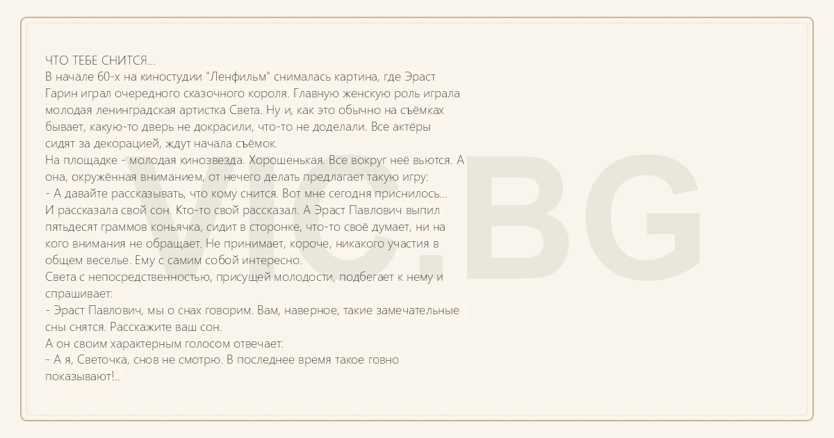 - А я, Светочка, снов не смотрю. В последнее время такое говно