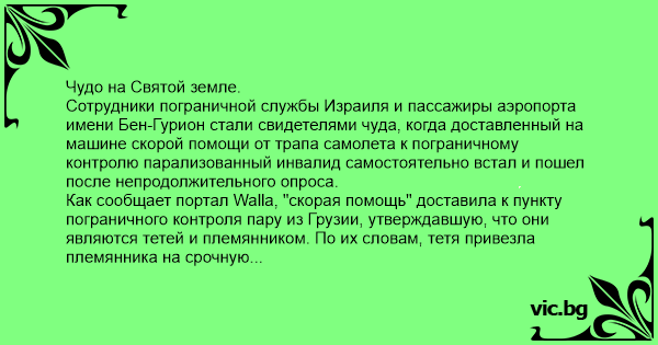 Сотрудники пограничной службы Израиля и пассажиры аэропорта имени Бен-Гурион стали свидетелями чуда, когда доставленный на машине скорой помощи от трапа самолета к пограничному контролю парализованный инвалид самостоятельно встал и пошел после непродолжительного опроса.