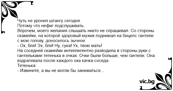 Чуть не уронил штангу сегодня. Потому что нефиг подслушивать. Впрочем, моего желания слышать никто не спрашивал. Со стороны скамейки, на которой здоровый мужик поднимал на бицепс гантели с мою голову, доносилось зычное: - Ох, бля! Эх, бля! Ну, cуka! Ух, твою мать! На соседней скамейки интеллигентно разводила в стороны руки с гантельками тетенька в очках. Очки были больше, чем гантели. Она вздрагивала после каждого оха качка-соседа. Тетенька: - Извините, а вы не могли бы заниматься бодибилдингом без использования обсценной лексики? - Ты че, мать, без мата я бы на 20 кэгэ меньше бы поднимал. Это пол твоего веса! - Но это же абсурдно! - Да стопудово! Исследования проводили, мат увеличивает производительность на 20% - В самом деле? - Научный факт, зуб даю! Тетенька подошла к стойке, взяла гантельки покрупнее и вернулась на исходную позицию. - Ох, бля, извините! Ух, бля, извините! Эх, прошу прощения, cуka! Ах... работает, мать твою, тысяча извинений! Роман Розенгурт