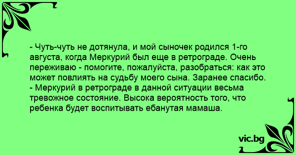 - Чуть-чуть не дотянула, и мой сыночек родился 1-го августа, когда Меркурий был еще в ретрограде. Очень переживаю - помогите, пожалуйста, разобраться: как это может повлиять на судьбу моего сына. Заранее спасибо.