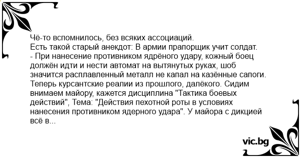 - При нанесение противником ядрёного удару, кожный боец должён идти и нести автомат на вытянутых руках, шоб значится расплавленный металл не капал на казённые сапоги.
