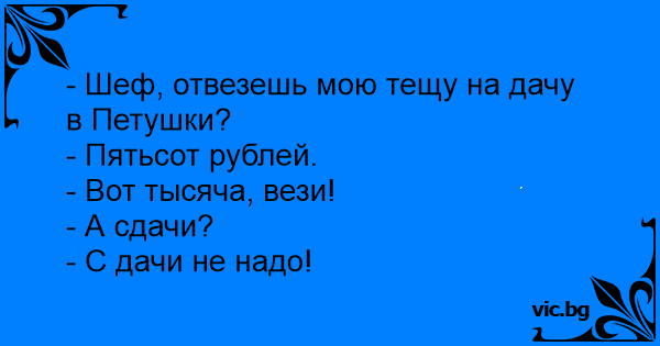 - Шеф, отвезешь мою тещу на дачу в Петушки?