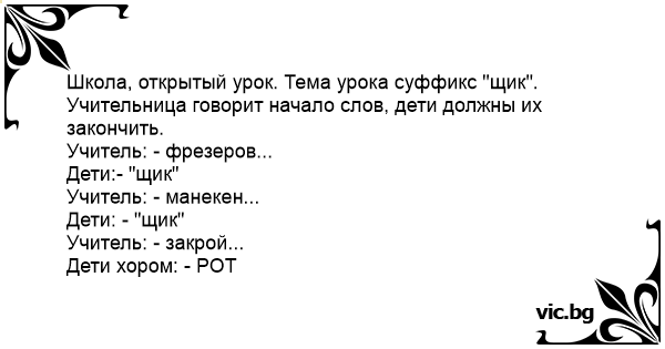 Школа, открытый урок. Тема урока суффикс "щик". Учительница говорит начало слов, дети должны их закончить.
