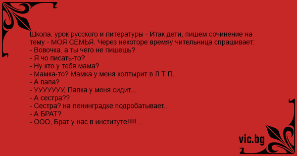 Школа. урок русского и литературы - Итак дети, пишем сочинение на тему - МОЯ СЕМЬЯ. Через некоторе времяу чительница спрашивает: