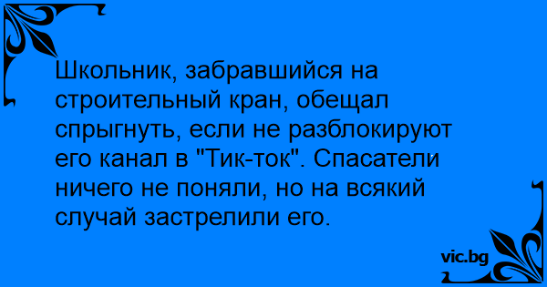 Школьник, забравшийся на строительный кран, обещал спрыгнуть, если не разблокируют его канал в "Тик-ток". Спасатели ничего не поняли, но на всякий случай застрелили его.