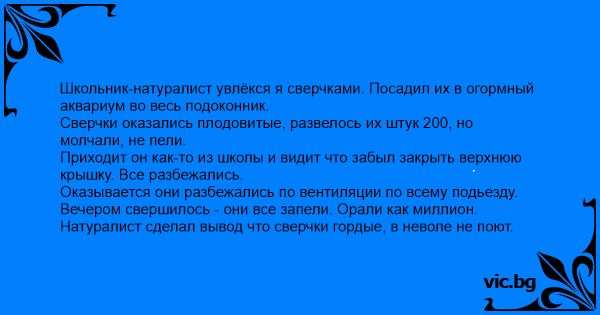 Школьник-натуралист увлёкся я сверчками. Посадил их в огормный аквариум во весь подоконник.