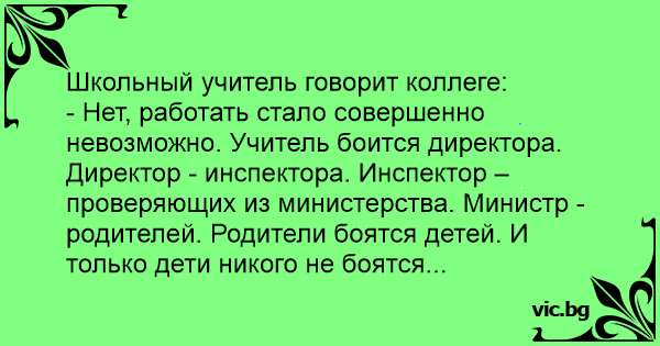 - Нет, работать стало совершенно невозможно. Учитель боится директора. Директор - инспектора. Инспектор – проверяющих из министерства. Министр - родителей. Родители боятся детей. И только дети никого не боятся...