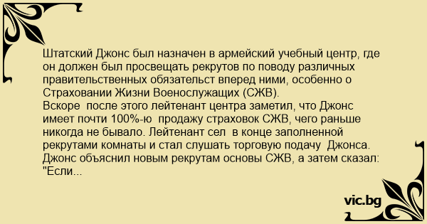 Вскоре после этого лейтенант центра заметил, что Джонс имеет почти 100%-ю продажу страховок СЖВ, чего раньше никогда не бывало. Лейтенант сел в конце заполненной рекрутами комнаты и стал слушать торговую подачу Джонса. Джонс объяснил новым рекрутам основы СЖВ, а затем сказал: