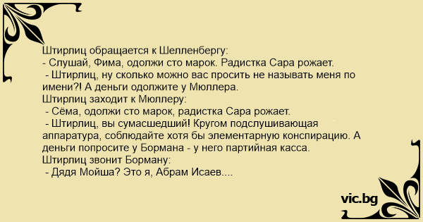 - Дядя Мойша? Это я, Абрам Исаев. Одолжи сто марок, радистка Сара рожает.