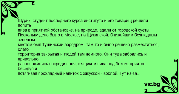 Шурик, студент последнего курса института и его товарищ решили попить пива в приятной обстановке, на природе, вдали от городской суеты. Поскольку дело было в Москве, на Щукинской, ближайшим безлюдным зеленым местом был Тушинский аэродром. Там-то и было решено разместиться, благо территория закрытая и людей там немного. Они туда забрались и привольно расположились посреди поля, с ящиком пива под боком, приятно беседуя и потягивая прохладный напиток с закуской - воблой. Тут из-за горизонта показываются три здоровых десантника и идут по направлению к приятелям. Один из вояк очень навеселе, сильно шатается и что-то кричит им типа: "А хpeнa вы тут сидите!! Территория закрытая..." Тут до Шурика медленно доходит, что сегодня день десантника... как пить дать, достанется по шее, ребята здоровые, мало не покажется... Шурик неожиданно встает и, вытянувшись по стойке "смирно", как учили на военной кафедре, которую он недавно окончил, браво так рапортует: "Разрешите представиться. Лейтенант запаса ПВО Прохоров. Товарищ сержант, почему так криво стоите и не по уставу обращаетесь?" У десантника срабатывает военный инстинкт, он вытягивается по стойке "смирно" и что-то по форме отвечает... Боевой пыл сержанта проходит и все обходится благополучно... (Возможно, что-нибудь приукрашено, пишу по чужим словам)