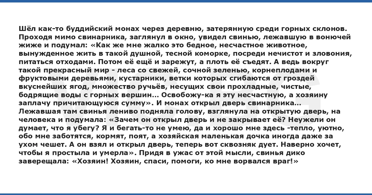 Шёл как-то буддийский монах через деревню, затерянную среди горных склонов. Проходя мимо свинарника, заглянул в окно, увидел свинью, лежавшую в вонючей жиже и подумал: «Как же мне жалко это бедное, несчастное животное, вынужденное жить в такой душной, тесной коморке, посреди нечистот и зловония, питаться отходами. Потом её ещё и зарежут, а плоть её съедят. А ведь вокруг такой прекрасный мир - леса со свежей, сочной зеленью, корнеплодами и фруктовыми деревьями, кустарники, ветки которых сгибаются от гроздей вкуснейших ягод, множество ручьёв, несущих свои прохладные, чистые, бодрящие воды с горных вершин… Освобожу-ка я эту несчастную, а хозяину заплачу причитающуюся сумму». И монах открыл дверь свинарника… Лежавшая там свинья лениво подняла голову, взглянула на открытую дверь, на человека и подумала: «Зачем он открыл дверь и не закрывает её? Неужели он думает, что я убегу? Я и бегать-то не умею, да и хорошо мне здесь -тепло, уютно, обо мне заботятся, кормят, поят, а хозяйская маленькая дочка иногда даже за ухом чешет. А он взял и открыл дверь, теперь вот сквозняк дует. Наверно хочет, чтобы я простыла и умерла». Придя в ужас от этой мысли, свинья дико заверещала: «Хозяин! Хозяин, спаси, помоги, ко мне ворвался враг!»