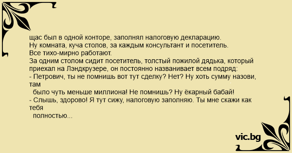 - Слышь, здорово! Я тут сижу, налоговую заполняю. Ты мне скажи как тебя