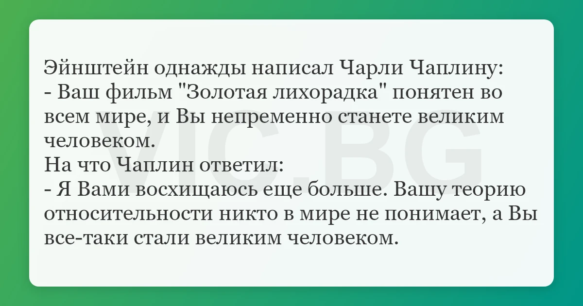 Эйнштейн однажды написал Чарли Чаплину: - Ваш фильм "Золотая лихорадка" понятен во всем мире, и Вы непременно станете великим человеком. На что Чаплин ответил: - Я Вами восхищаюсь еще больше. Вашу теорию относительности никто в мире не понимает, а Вы все-таки стали великим человеком.