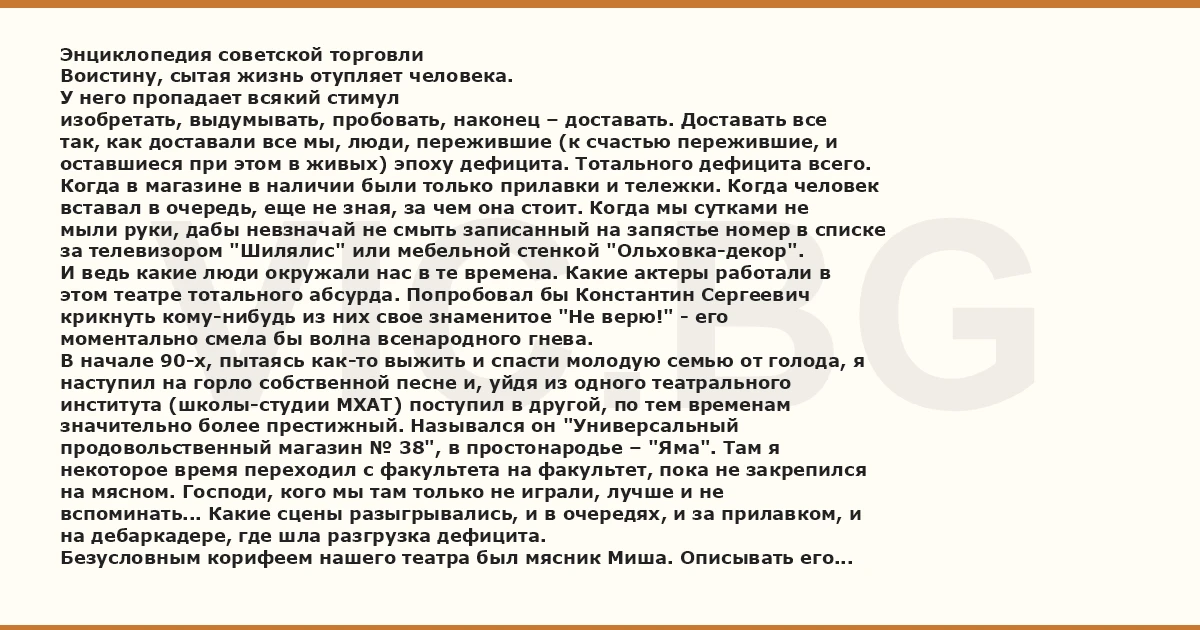 Энциклопедия советской торговли Воистину, сытая жизнь отупляет человека. У него пропадает всякий стимул изобретать, выдумывать, пробовать, наконец – доставать. Доставать все так, как доставали все мы, люди, пережившие (к счастью пережившие, и оставшиеся при этом в живых) эпоху дефицита. Тотального дефицита всего. Когда в магазине в наличии были только прилавки и тележки. Когда человек вставал в очередь, еще не зная, за чем она стоит. Когда мы сутками не мыли руки, дабы невзначай не смыть записанный на запястье номер в списке за телевизором "Шилялис" или мебельной стенкой "Ольховка-декор". И ведь какие люди окружали нас в те времена. Какие актеры работали в этом театре тотального абсурда. Попробовал бы Константин Сергеевич крикнуть кому-нибудь из них свое знаменитое "Не верю!" - его моментально смела бы волна всенародного гнева. В начале 90-х, пытаясь как-то выжить и спасти молодую семью от голода, я наступил на горло собственной песне и, уйдя из одного театрального института (школы-студии МХАТ) поступил в другой, по тем временам значительно более престижный. Назывался он "Универсальный продовольственный магазин № 38", в простонародье – "Яма". Там я некоторое время переходил с факультета на факультет, пока не закрепился на мясном. Господи, кого мы там только не играли, лучше и не вспоминать... Какие сцены разыгрывались, и в очередях, и за прилавком, и на дебаркадере, где шла разгрузка дефицита. Безусловным корифеем нашего театра был мясник Миша. Описывать его внешность нет никакой нужды. Достаточно представить себе классического мясника, невысокого, кряжистого, с кулаком в голову среднестатистического студента и вы получите нашего Мишу, самого великого (из известных мне) артиста нашего московского микрорайона. Это был безусловный талант, которым восхищался весь универсам. На один только его "номер с косточкой" сходились посмотреть все продавцы. Представление давалось обычно раз в неделю. Заранее его никто не анонсировал, поэтому редко кому удавалось наблюдать его с самого начала. Поскольку я сам стоял у прилавка, за и перед которым проходило действо, мне посчастливилось наблюдать его неоднократно. Однако я с удовольствием каждый раз просматривал его заново, подмечая новые черточки мишиной игры. Начиналось все с того, что в универсам завозили хорошие говяжьи туши. Не гуманитарную бескостную, сверхглубокой заморозки, помощь 1964 года забоя (клянусь, я сам видел синие штампы на бледно-бурдовых мясных пластинах), а наше, нормальное российское мясо. Прочуявший об этом народ тут же выстраивался в многорядную, извивающуюся по всему немаленькому залу, живую очередь и заранее начинал волноваться. Ну, прям в точности зрители перед открытием занавеса. Они еще не догадывались о том, что в начинающемся уже спектакле одному из них даже предстоит исполнить одну из главных ролей, ибо "номер с косточкой" относился к числу первых российских массовых риалти-шоу. Между тем, Миша выходил к прилавку, за которым держал оборону ваш покорный слуга, и зорко осматривал очередь. Из числа покупателей он выбирал тот самый главный объект, кому сегодня повезет стать звездой на ближайшие полчаса. Кандидата Миша подбирал по приметам. Это должен был быть обязательно мужчина, желательно в плаще, лет сорока-сорока пяти, без головного убора, ростом с Мишу, но в плечах – раз в пя