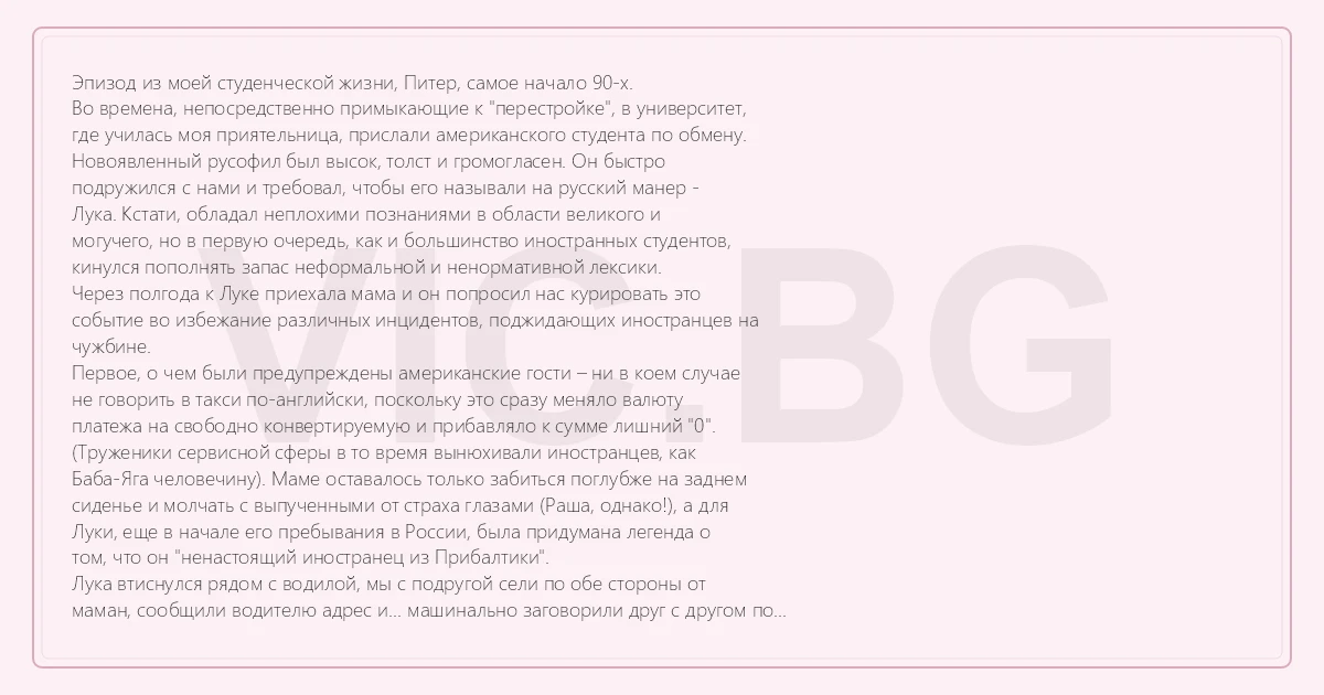 Эпизод из моей студенческой жизни, Питер, самое начало 90-х. Во времена, непосредственно примыкающие к "перестройке", в университет, где училась моя приятельница, прислали американского студента по обмену. Новоявленный русофил был высок, толст и громогласен. Он быстро подружился с нами и требовал, чтобы его называли на русский манер - Лука. Кстати, обладал неплохими познаниями в области великого и могучего, но в первую очередь, как и большинство иностранных студентов, кинулся пополнять запас неформальной и ненормативной лексики. Через полгода к Луке приехала мама и он попросил нас курировать это событие во избежание различных инцидентов, поджидающих иностранцев на чужбине. Первое, о чем были предупреждены американские гости – ни в коем случае не говорить в такси по-английски, поскольку это сразу меняло валюту платежа на свободно конвертируемую и прибавляло к сумме лишний "0". (Труженики сервисной сферы в то время вынюхивали иностранцев, как Баба-Яга человечину). Маме оставалось только забиться поглубже на заднем сиденье и молчать с выпученными от страха глазами (Раша, однако!), а для Луки, еще в начале его пребывания в России, была придумана легенда о том, что он "ненастоящий иностранец из Прибалтики". Лука втиснулся рядом с водилой, мы с подругой сели по обе стороны от маман, сообщили водителю адрес и... машинально заговорили друг с другом по английски! Главное, форины – как и договаривались – ни гу-гу, а мы-то, спрашивается, куда?!! Этикет подвел: привыкли, что в обществе следует разговаривать на том языке, на котором говорят гости... Водила обернулся, в глазах – плотоядный восторг: - Американцы?!! На что Лука навис над ним как скала и, хлопнув по спине со всей дури, произнес: - Друг, ты что – ох...ел? Наши мы, эстонские!" Trolik