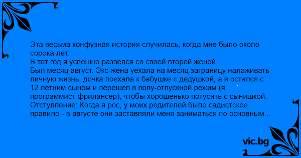 Был месяц август. Экс-жена уехала на месяц заграницу налаживать личную жизнь, дочка поехала к бабушке с дедушкой, а я остался с 12 летним сыном и перешел в полу-отпускной режим (я программист фрилансер), чтобы хорошенько потусить с сынишкой.