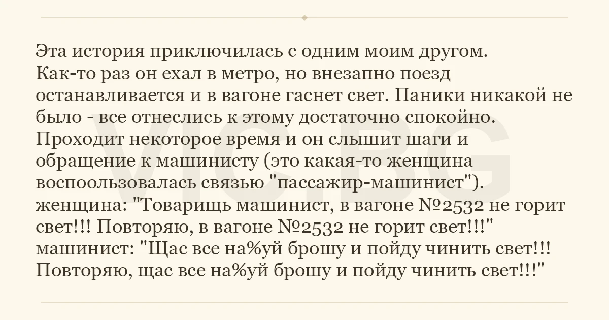 Эта история приключилась с одним моим другом. Как-то раз он ехал в метро, но внезапно поезд останавливается и в вагоне гаснет свет. Паники никакой не было - все отнеслись к этому достаточно спокойно. Проходит некоторое время и он слышит шаги и обращение к машинисту (это какая-то женщина воспоользовалась связью "пассажир-машинист"). женщина: "Товарищь машинист, в вагоне №2532 не горит свет!!! Повторяю, в вагоне №2532 не горит свет!!!" машинист: "Щас все на%уй брошу и пойду чинить свет!!! Повторяю, щас все на%уй брошу и пойду чинить свет!!!"