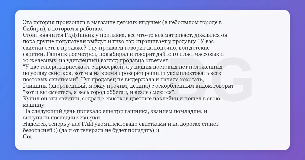 Эта история произошла в магазине детских игрушек (в небольшом городе в Сибири), в котором я работаю. Стоит значится ГБДДшник у прилавка, все что-то высматривает, дождался он пока другие покупатели выйдут и тихо так спрашивает у продавца "У вас свистки есть в продаже?", ну продавец говорит да конечно, вон детские свистки. Гашник посмотрел, повыбирал и говорит дайте 10 пластмассовых и 10 железных, на удивленный взгляд продавца отвечает: "У нас генерал приезжает с проверкой, а у наших постовых нет положенных по уставу свистков, вот мы на время проверки решили укомплектовать всех постовых свистками”. Тут продавец не выдержала и начала хохотать, Гаишник (здоровенный, между прочим, детина) с оскорбленным видом говорит "вот и вы смеетесь, я весь город оббегал, и везде смеются". Купил он эти свистки, содрал с свистков цветные наклейки и пошел в свою машину. На следующий день приехало еще три гашника, званием помладше, и выкупили последние свистки. Надеюсь, теперь у нас ГАЙ укомплектовано свистками и на дорогах станет безопасней :) (да и от генерала не будет попадать) :) Gor