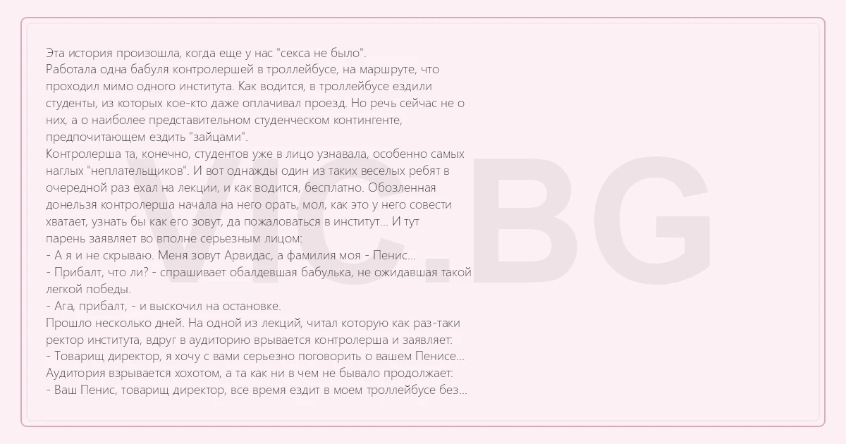 Эта история произошла, когда еще у нас "cekca не было". Работала одна бабуля контролершей в троллейбусе, на маршруте, что проходил мимо одного института. Как водится, в троллейбусе ездили студенты, из которых кое-кто даже оплачивал проезд. Но речь сейчас не о них, а о наиболее представительном студенческом контингенте, предпочитающем ездить "зайцами". Контролерша та, конечно, студентов уже в лицо узнавала, особенно самых наглых "неплательщиков". И вот однажды один из таких веселых ребят в очередной раз ехал на лекции, и как водится, бесплатно. Обозленная донельзя контролерша начала на него орать, мол, как это у него совести хватает, узнать бы как его зовут, да пожаловаться в институт... И тут парень заявляет во вполне серьезным лицом: - А я и не скрываю. Меня зовут Арвидас, а фамилия моя - Пeниc... - Прибалт, что ли? - спрашивает обалдевшая бабулька, не ожидавшая такой легкой победы. - Ага, прибалт, - и выскочил на остановке. Прошло несколько дней. На одной из лекций, читал которую как раз-таки ректор института, вдруг в аудиторию врывается контролерша и заявляет: - Товарищ директор, я хочу с вами серьезно поговорить о вашем Пенисе... Аудитория взрывается хохотом, а та как ни в чем не бывало продолжает: - Ваш Пeниc, товарищ директор, все время ездит в моем троллейбусе без билета. Ректор начинает соображать в чем дело: - Мой пeниc ездит всегда только со мной, - и едва сдерживает смех. - Да что вы говорите! Я говорю о вашем Пенисе, об этом длинном лохматом наглом Пенисе... Присутствующие на лекции бьются в истерике и медленно сползают на пол. Контролерша продолжает: - Ваш нахальный Пeниc даже не встанет, когда перед ним женщина... Ректор сам начинает смеяться, и отвечает: - А зачем ему вставать, у меня дома жена есть... - При чем тут ваша жена? Ваш Пeниc просто хулиган, сделайте с ним что-нибудь... ... Конечно, потом все выяснилось, виновник и зачинщик этой истории был вычислен... Но еще долго студенты, едва увидев эту контролершу в троллейбусе, кричали: "Моя фамилия Пeниc..."