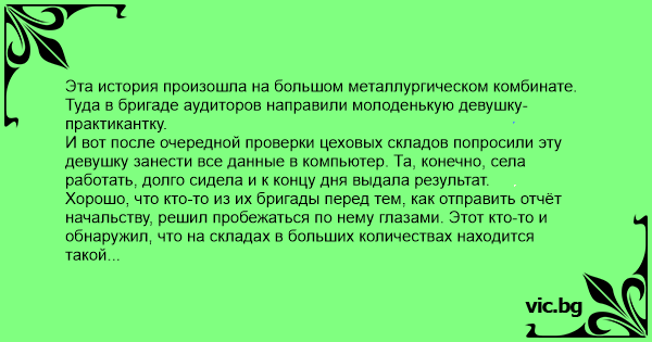 И вот после очередной проверки цеховых складов попросили эту девушку занести все данные в компьютер. Та, конечно, села работать, долго сидела и к концу дня выдала результат.