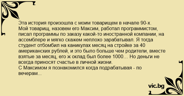 Мой товарищ, назовем его Максим, работал программистом, писал программы по заказу какой-то иностранной компании, на ассемблере и мягко скажем неплохо зарабатывал. Я тогда студент отбомбил на каникулах месяц на стройке за 40 американских рублей, и это было больше чем родители, вместе взятые за месяц, его ж оклад был более 1000… Но деньги не всегда приносят счастье в личной жизни.