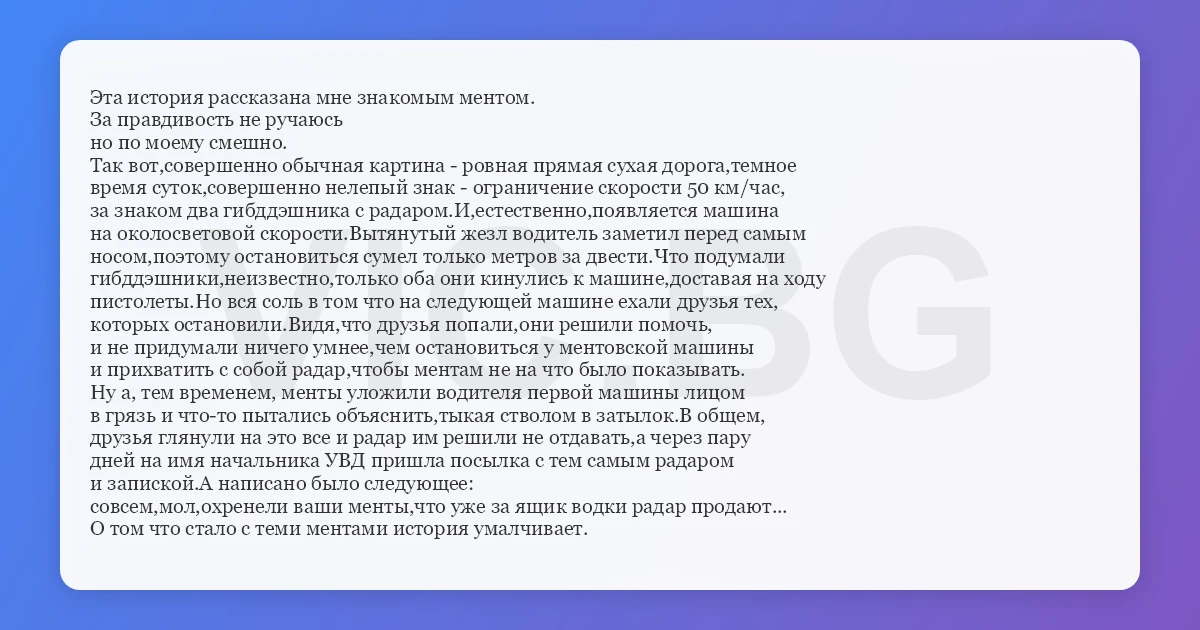 Эта история рассказана мне знакомым ментом. За правдивость не ручаюсь но по моему смешно. Так вот,совершенно обычная картина - ровная прямая сухая дорога,темное время суток,совершенно нелепый знак - ограничение скорости 50 км/час, за знаком два гибддэшника с радаром.И,естественно,появляется машина на околосветовой скорости.Вытянутый жезл водитель заметил перед самым носом,поэтому остановиться сумел только метров за двести.Что подумали гибддэшники,неизвестно,только оба они кинулись к машине,доставая на ходу пистолеты.Но вся соль в том что на следующей машине ехали друзья тех, которых остановили.Видя,что друзья попали,они решили помочь, и не придумали ничего умнее,чем остановиться у ментовской машины и прихватить с собой радар,чтобы ментам не на что было показывать. Ну а, тем временем, менты уложили водителя первой машины лицом в грязь и что-то пытались объяснить,тыкая стволом в затылок.В общем, друзья глянули на это все и радар им решили не отдавать,а через пару дней на имя начальника УВД пришла посылка с тем самым радаром и запиской.А написано было следующее: совсем,мол,охренели ваши менты,что уже за ящик водки радар продают... О том что стало с теми ментами история умалчивает.