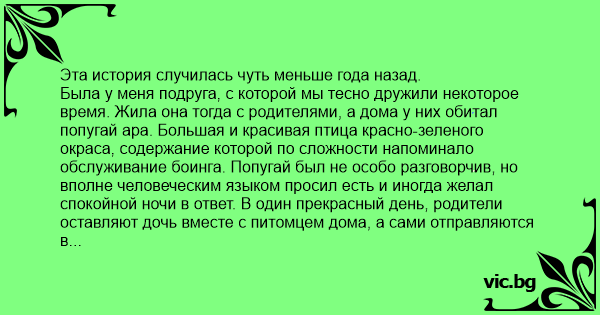 Была у меня подруга, с которой мы тесно дружили некоторое время. Жила она тогда с родителями, а дома у них обитал попугай ара. Большая и красивая птица красно-зеленого окраса, содержание которой по сложности напоминало обслуживание боинга. Попугай был не особо разговорчив, но вполне человеческим языком просил есть и иногда желал спокойной ночи в ответ. В один прекрасный день, родители оставляют дочь вместе с питомцем дома, а сами отправляются в Турцию на 10 дней. Уже через пару часов после отъезда я стоял на пороге их квартиры, и уезжать оттуда не планировал, пока шасси обратного самолета не коснутся взлетной полосы. Так мы и жили там все это время втроем. Но рано или поздно все хорошее заканчивается, так что по конец отпуска из квартиры были убраны все следы пребывания парня, о котором родители не знали, а я поспешно удалился восвояси. И все было бы хорошо, но спустя несколько дней оказалось, что мое регулярное общение с попугаем по вечерам не прошло даром. Глава семейства допил чай, выключил в квартире свет и по пути в спальню решил попрощаться с питомцем.
