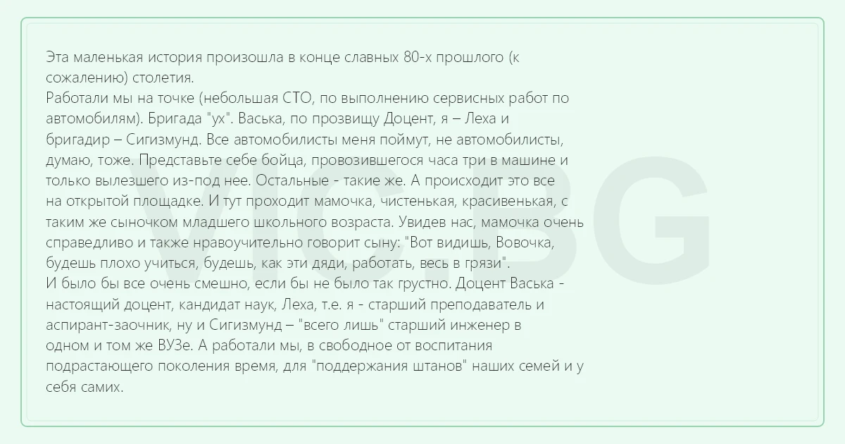 Эта маленькая история произошла в конце славных 80-х прошлого (к сожалению) столетия. Работали мы на точке (небольшая СТО, по выполнению сервисных работ по автомобилям). Бригада "ух". Васька, по прозвищу Доцент, я – Леха и бригадир – Сигизмунд. Все автомобилисты меня поймут, не автомобилисты, думаю, тоже. Представьте себе бойца, провозившегося часа три в машине и только вылезшего из-под нее. Остальные - такие же. А происходит это все на открытой площадке. И тут проходит мамочка, чистенькая, красивенькая, с таким же сыночком младшего школьного возраста. Увидев нас, мамочка очень справедливо и также нравоучительно говорит сыну: "Вот видишь, Вовочка, будешь плохо учиться, будешь, как эти дяди, работать, весь в грязи". И было бы все очень смешно, если бы не было так грустно. Доцент Васька - настоящий доцент, кандидат наук, Леха, т.е. я - старший преподаватель и аспирант-заочник, ну и Сигизмунд – "всего лишь" старший инженер в одном и том же ВУЗе. А работали мы, в свободное от воспитания подрастающего поколения время, для "поддержания штанов" наших семей и у себя самих.