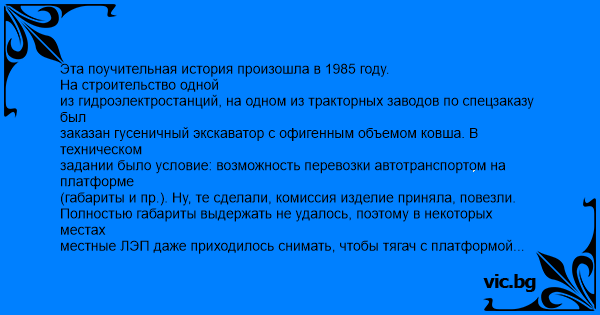 Эта поучительная история произошла в 1985 году. На строительство одной из гидроэлектростанций, на одном из тракторных заводов по спецзаказу был заказан гусеничный экскаватор с офигенным объемом ковша. В техническом задании было условие: возможность перевозки автотранспортом на платформе (габариты и пр.). Ну, те сделали, комиссия изделие приняла, повезли. Полностью габариты выдержать не удалось, поэтому в некоторых местах местные ЛЭП даже приходилось снимать, чтобы тягач с платформой проехал. Одному из сопровождающих пришла в голову идея: прямо на платформе, вовремя перевозки запустить дизель у экскаватора и пусть, дескать, работает, ехать 3-4 дня, глядишь и обкатается немного за эти дни на холостых оборотах. Так и сделали. Едут, все нормально, дизель молотит, тягач едет. Сопровождающие задремали. Водитель прибавил. Вдруг заметил, что, проезжающие навстречу машины мигают фарами и водители их крутят пальцем у виска. Прислушался к мотору, погладел по сторонам, все нормально, еще прибавил. Остановился только тогда, когда три (!) гаишных машины с матюками, мигалками и пистолетами начали кружить вокруг него и требовать остановиться. Водила вылазит, смотрит и охуевает: стрела экскаватора торчит вертикально вверх, 20 метров плюс ковш. Смотрит вперед, охуевает еще сильнее – в тридцати метрах ЛЭП 220кВ. Полезли смотреть. Оказалось, что во время перевозки, от тряски выпало лобовое стекло водителя, упало на рычаг управления стрелой, а так как двигатель был включен, та естественно пошла вверх, дошла до крайнего положения и конечник ее отключил. Оказалось, что ехали так километров 25. Представлете картину: по шоссе херачит тягач с платформой, на ней глыба металла с вытянутой «рукой» стрелы и «пастью» ковша. На счастье горе-перевозчиков по пути других ЛЭПов не было – 25-километровый участок трассы был чистым. Мужики потом сутки квасили и материли подавшего идею. Экскаватор все-таки довезли.
