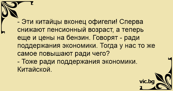 - Эти китайцы вконец офигели! Сперва снижают пенсионный возраст, а теперь еще и цены на бензин. Говорят - ради поддержания экономики. Тогда у нас то же самое повышают ради чего?