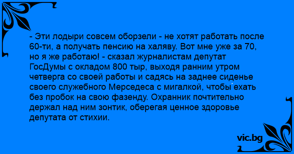 - Эти лодыри совсем оборзели - не хотят работать после 60-ти, а получать пенсию на халяву. Вот мне уже за 70, но я же работаю! - сказал журналистам депутат ГосДумы с окладом 800 тыр, выходя ранним утром четверга со своей работы и садясь на заднее сиденье своего служебного Мерседеса с мигалкой, чтобы ехать без пробок на свою фазенду. Охранник почтительно держал над ним зонтик, оберегая ценное здоровье депутата от стихии.