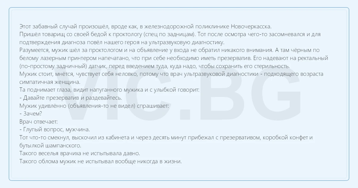 Этот забавный случай произошёл, вроде как, в железнодорожной поликлинике Новочеркасска. Пришёл товарищ со своей бедой к проктологу (спец по задницам). Тот после осмотра чего-то засомневался и для подтверждения диагноза повёл нашего героя на ультразвуковую диагностику. Разумеется, мужик шёл за проктологом и на объявление у входа не обратил никакого внимания. А там чёрным по белому лазерным принтером напечатано, что при себе необходимо иметь пpeзepbatиb. Его надевают на ректальный (по-простому задничный) датчик, перед введением туда, куда надо, чтобы сохранить его стерильность. Мужик стоит, мнётся, чувствует себя неловко, потому что врач ультразвуковой диагностики - подходящего возраста симпатичная женщина. Та поднимает глаза, видит напуганного мужика и с улыбкой говорит: - Давайте пpeзepbatиb и раздевайтесь. Мужик удивлённо (объявления-то не видел) спрашивает: - Зачем? Врач отвечает: - Глупый вопрос, мужчина. Тот что-то смекнул, выскочил из кабинета и через десять минут прибежал с презервативом, коробкой конфет и бутылкой шампанского. Такого веселья врачиха не испытывала давно. Такого облома мужик не испытывал вообще никогда в жизни.
