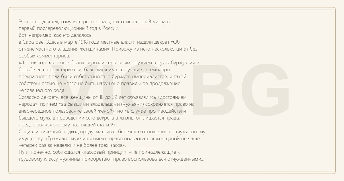 Этот текст для тех, кому интересно знать, как отмечалось 8 марта в первый послереволюционный год в России. Вот, например, как это делалось в Саратове. Здесь в марте 1918 года местные власти издали декрет «Об отмене частного владения женщинами». Привожу из него несколько цитат без особых комментариев. «До сих пор законные браки служили серьезным оружием в руках буржуазии в борьбе ее с пролетариатом, благодаря им все лучшие экземпляры прекрасного пола были собственностью буржуев империалистов, и такой собственностью не могло не быть нарушено правильное продолжение человеческого рода». Согласно декрету, все женщины от 18 до 32 лет объявлялись «достоянием народа», причем «за бывшими владельцами (мужьями) сохраняется право на внеочередное пользование своей женой», но «в случае противодействия бывшего мужа в проведении сего декрета в жизнь, он лишается права, предоставляемого ему настоящей статьей». Социалистический подход предусматривал бережное отношение к отчужденному имуществу: «Граждане мужчины имеют право пользоваться женщиной не чаще четырех раз за неделю и не более трех часов». Ну и, конечно, соблюдался классовый принцип: «He принадлежащие к трудовому классу мужчины приобретают право воспользоваться отчужденными женщинами при условии ежемесячного взноса в 1000 рублей». А что-то все же есть в этом декрете…